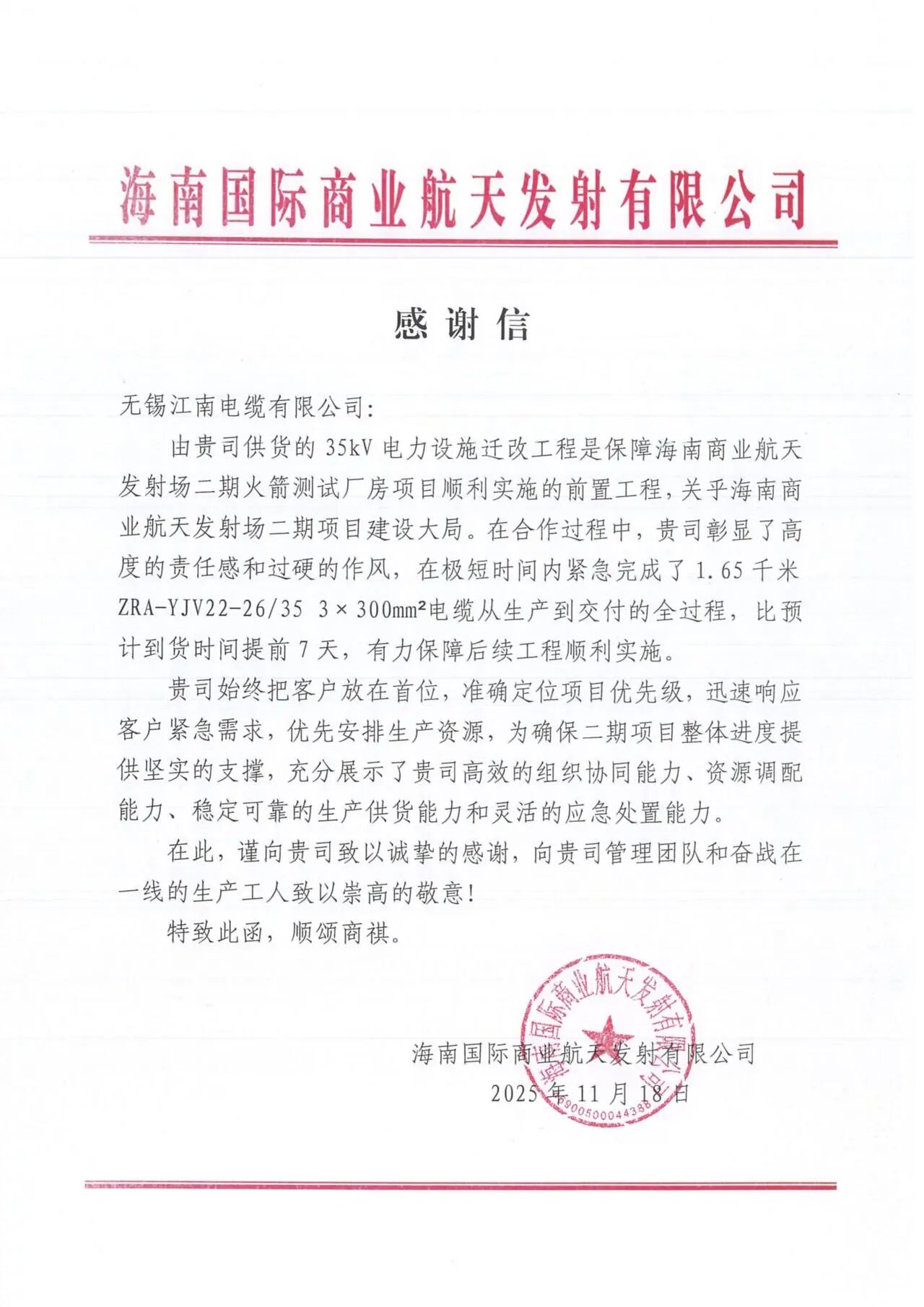 近日,江南電纜收到來自海南國(guó)際商業(yè)航天發(fā)射有限公司的一封感謝信,對(duì)公司高效的組織協(xié)同能力、資源調(diào)配能力、穩(wěn)定可靠的生產(chǎn)供貨能力和靈活的應(yīng)急處置能力,表示高度肯定!
