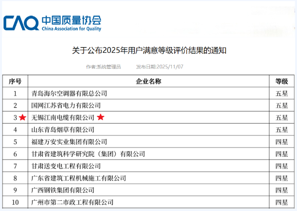 【喜報(bào)】江南電纜榮膺 “用戶(hù)滿(mǎn)意五星級(jí)企業(yè)” 稱(chēng)號(hào)!
